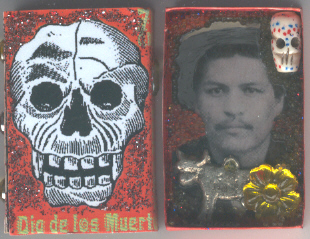 Vaquero Matchbox Shrine Day of the Dead nicho honoring the original cowboys. The images are from Ten Two Studios Dia de los Muertos faux postage collection and Wild Wild West image CD. The objects in the shrine are a skull bead, a cow-shaped milagro and a sparkly yellow flower to represent the marigolds often used to decorate Day of the Dead altars. |